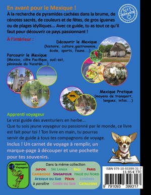 En avant pour le Mexique ! Le vrai guide desaventuriers en herbe ! À la recherche de pyramides cachées dans labrume, de cénotes sacrés, de couleurs et de fête, de gros iguanes oude plages idylliques... Destiné aux jeunes, voyageurs ou passionnés par lemonde, ce livre contient tout ce qu’il faut pour appréhender ce pays passionnantet servir de guide à tous ses compagnons de voyage. Contenu : Unesection pour découvrir le Mexique : géographie, histoire, culture, mode vie,arts, gastronomie, sports, faune et flore... Une section de visitedu pays par régions : Mexico D.F., la côte Pacifique, le Sud-est, lapéninsule du Yucatán... Une section pratique : moyens de transport,langues, infos pratiques, conseils. Les petits plus : une mise enpage attractive (colorée, textes courts, nombreuses photos et illustrations),une section pour décrire ses expériences de voyage, une pochette pour conserverses souvenirs, un marque-page à découper.