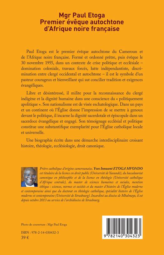 Paul Etoga est le premier évêque autochtone du Cameroun et de l'Afrique noire française. Formé et ordonné prêtre, puis évêque le 30 novembre 1955, dans un contexte de crise politique et ecclésiale - domination coloniale, travaux forcés, lutte indépendantiste, discrimination entre clergé occidental et autochtone - il est le symbole d'un pasteur courageux et bienveillant qui sut concilier tradition et exigences évangéliques. Libre et désintéressé, il milite pour la reconnaissance du clergé indigène et la dignité humaine dans une conscience du politiquement apolitique . Son nationalisme est de visée eschatologique. Dans un pays et un continent où l'Église donne l'impression de se mettre à genoux devant le politique, il incarne la dignité sacerdotale et épiscopale dans un sacerdoce évangélique et engagé. Son témoignage ecclésial et politique constitue une substantifique exemplarité pour l'Église catholique locale et universelle. Une biographie écrite dans une démarche interdisciplinaire croisant histoire, théologie, ecclésiologie, droit canonique.