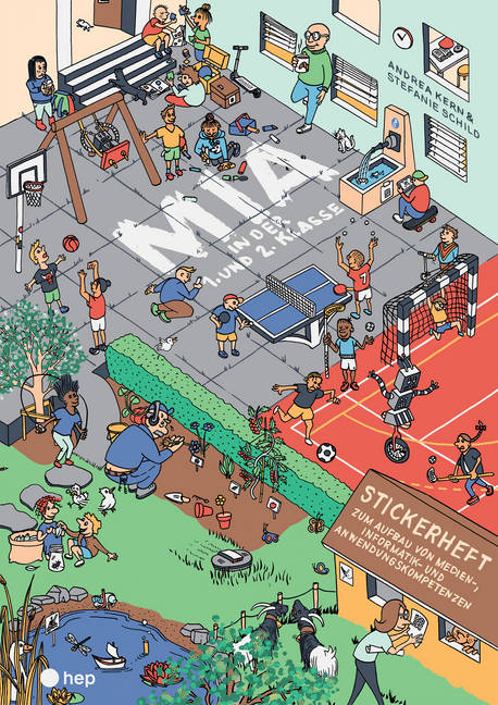 Sticker-Sammelheft: Das Heft enthält zehn anregende Wimmelbilder aus dem Schulalltag (Schulzimmer, Schulhaus, Schulhausgang, Pausenplatz, Bibliothek, Wald usw.). Auf jedem Wimmelbild führen mehrere QR-Codes zu kurzen Hörbeiträgen. Alternativ sind die Hörbeiträge auch direkt über die Website www.mia-heft.ch verfügbar. Die Wimmelbilder sollen zudem Ausgangspunkt für zahlreiche Gespräche rund um die Themen Digitalisierung und Mediensozialisation sein.