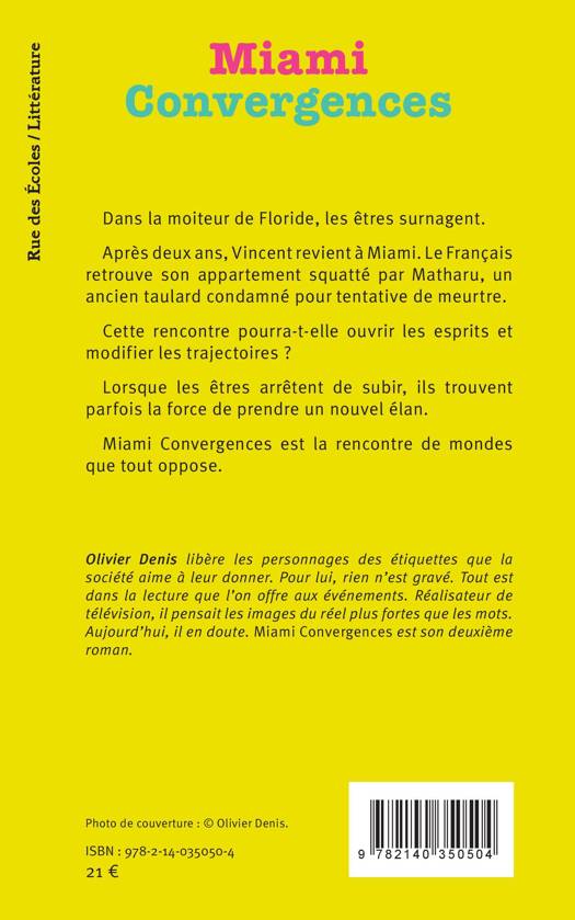 Dans la moiteur de Floride, les êtres surnagent. Après deux ans, Vincent revient à Miami. Le Français retrouve son appartement squatté par Matharu, un ancien taulard condamné pour tentative de meurtre. Cette rencontre pourra-t-elle ouvrir les esprits et modifier les trajectoires ? Lorsque les êtres arrêtent de subir, ils trouvent parfois la force de prendre un nouvel élan. Miami Convergences est la rencontre de mondes que tout oppose.