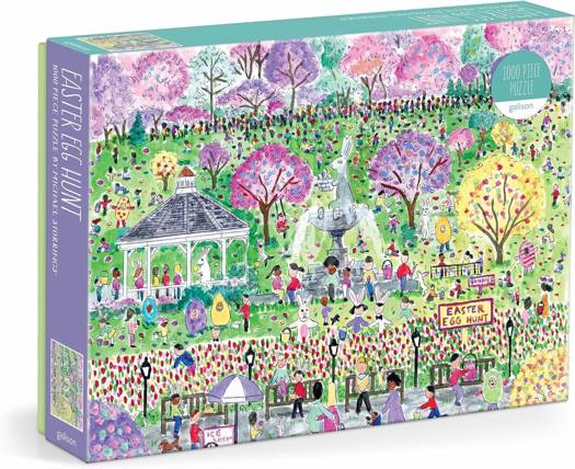 Award-winning designer, illustrator, and creative director Michael Storrings captures the spirit of Easter festivities with lawns full of happy children searching for treasures in a whimsical park. The Michael Storrings Easter Egg Hunt 1000 Piece Puzzle is complete with sherbet-colored trees, an Easter bunny fountain, puppies, bunnies, and more!