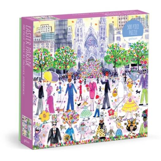 Award-winning designer, illustrator, and creative director Michael Storrings captures the joy and energy of a springtime Easter Parade. The Michael Storrings Easter Parade 500 Piece Puzzle showcases bright colors, unique characters, and springtime celebration.