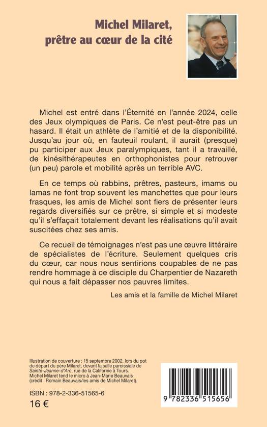 Michel est entré dans l'Éternité en l'année 2024, celle des Jeux olympiques de Paris. Ce n'est peut-être pas un hasard. Il était un athlète de l'amitié et de la disponibilité. Jusqu'au jour où, en fauteuil roulant, il aurait (presque) pu participer aux Jeux paralympiques, tant il a travaillé, de kinésithérapeutes en orthophonistes pour retrouver (un peu) parole et mobilité après un terrible AVC. En ce temps où rabbins, prêtres, pasteurs, imams ou lamas ne font trop souvent les manchettes que pour leurs frasques, les amis de Michel sont fiers de présenter leurs regards diversifiés sur ce prêtre, si simple et si modeste qu'il s'effaçait totalement devant les réalisations qu'il avait suscitées chez ses amis. Ce recueil de témoignages n'est pas une oeuvre littéraire de spécialistes de l'écriture. Seulement quelques cris du coeur, car nous nous sentirions coupables de ne pas rendre hommage à ce disciple du Charpentier de Nazareth qui nous a fait dépasser nos pauvres limites. Les amis et la famille de Michel Milaret