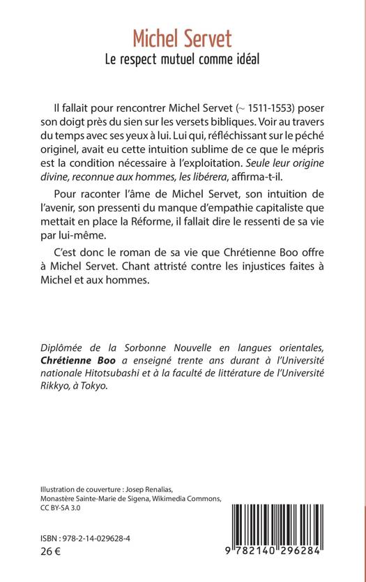 Il fallait pour rencontrer Michel Servet ( 1511-1553) poser son doigt près du sien sur les versets bibliques. Voir au travers du temps avec ses yeux à lui. Lui qui, réfléchissant sur le péché originel, avait eu cette intuition sublime de ce que le mépris est la condition nécessaire à l'exploitation. Seule leur origine divine, reconnue aux hommes, les libérera, affirma-t-il. Pour raconter l'âme de Michel Servet, son intuition de l'avenir, son pressenti du manque d'empathie capitaliste que mettait en place la Réforme, il fallait dire le ressenti de sa vie par lui-même. C'est donc le roman de sa vie que Chrétienne Boo offre à Michel Servet. Chant attristé contre les injustices faites à Michel et aux hommes.