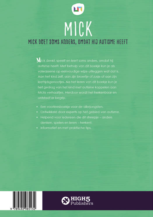 Mick Mick doet soms anders, omdat hij autisme heeft Mick denkt, speelt en leert soms anders, omdat hij autisme heeft. Met behulp van dit boekje kun je als volwassene op eenvoudige wijze uitleggen wat dat is. Aan het kind zelf, aan zijn broertje of zusje of aan zijn leeftijdsgenootjes. Na het lezen van dit boekje kun je het gedrag van het kind met autisme koppelen aan Micks verhaaltjes. Hierdoor wordt het herkenbaar en ontstaat er begrip. •Een voorleesboekje voor de allerjongsten. •Ontwikkeld door experts op het gebied van autisme. •Helpend voor iedereen die dit streepje – anders denken, spelen en leren – herkent. •Informatief en met praktische tips.