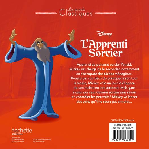 L’histoire :Apprenti du puissant sorcier Yensid, Mickey est chargé de le seconder, notamment en s’occupant des tâches ménagères. Poussé par son désir de pratiquer à son tour la magie, Mickey vole un jour le chapeau de son maître en son absence. Mais gare à celui qui veut devenir sorcier sans savoir en contrôler les pouvoirs ! Mickey va lancer des sorts qu’il ne saura pas annuler…