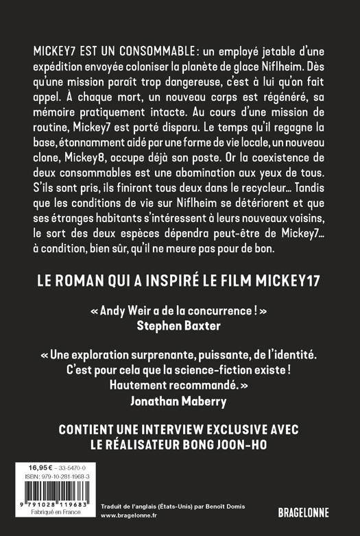 Mickey7 est un Consommable : un employé jetable d'une expédition humaine envoyée sur Niflheim, un monde de glace, pour le coloniser. Dès qu'une mission paraît trop dangereuse - voire suicidaire -, l'équipage se tourne vers lui. À la mort d'une version, un nouveau corps est régénéré, sa mémoire pratiquement intacte. Et après six morts, Mickey7 a bien compris pourquoi son poste restait le seul disponible de l'expédition quand il l'a accepté...