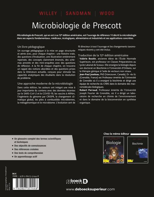 La "Microbiologie de Prescott" est traduction en français de la 12e édition du grand classique de la Microbiologie, le «Prescott's Microbiology». Un grand soin a été apporté à faire le tour des connaissances actuelles sur la pathogenèse des principaux micro-organismes pathogènes et sur les mécanismes de défense naturelle et acquise de l'hôte contre eux.