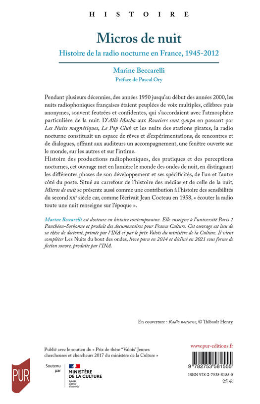 D'Allô Macha aux Routiers sont sympa en passant par Les Nuits magnétiques, Le Pop Club, Wango Tango et les nuits des stations pirates, la radio nocturne constitue depuis les années 1950 un espace de rêves et d'expérimentations. Cet ouvrage met en lumière le monde des ondes de nuit, en distinguant les différentes phases de son développement et ses spécificités, de l'un et de l'autre côté du poste. Situé au carrefour de l'histoire des médias et de celle de la nuit, Micros de nuit se présente aussi comme une contribution à l'histoire des sensibilités du second XXe siècle car, comme l'écrivait Jean Cocteau, « écouter la radio toute une nuit renseigne sur l'époque ».