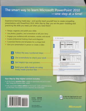 The smart way to learn the latest version of PowerPoint 2010-one step at a time! Build exactly the skills you need by working at your own pace through easy-to-follow lessons and hands-on practice files available online.