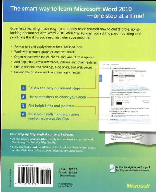 The smart way to learn the latest version of Word 2010-one step at a time! Build exactly the skills you need by working at your own pace through easy-to-follow lessons and hands-on practice files on CD.