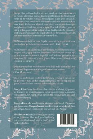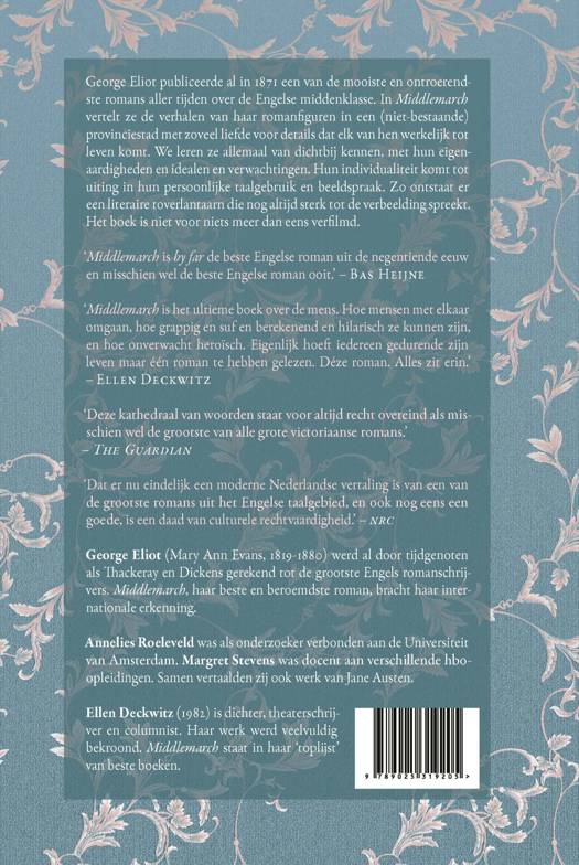 Middlemarch is het ultieme boek over de mens. Hoe mensen met elkaar omgaan, hoe grappig en suf en berekenend en hilarisch ze kunnen zijn, en hoe onverwacht heroïsch. Eigenlijk hoeft iedereen gedurende zijn leven maar een roman te hebben gelezen. Déze roman. Alles zit erin.’ – Ellen Deckwitz