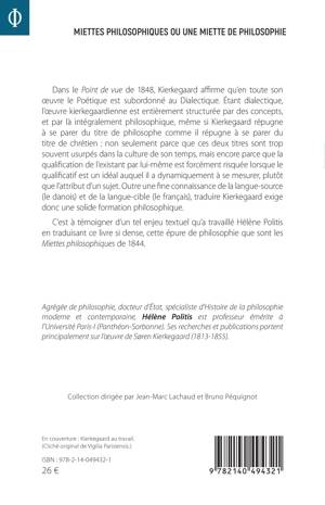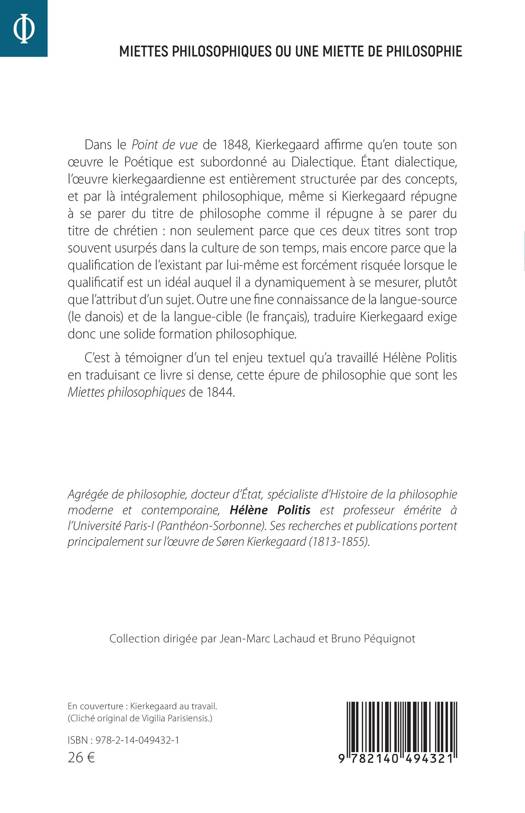 Dans le Point de vue de 1848, Kierkegaard affirme qu’en toute son œuvre le Poétique est subordonné au Dialectique. Étant dialectique, l’œuvre kierkegaardienne est entièrement structurée par des concepts, et par là intégralement philosophique, même si Kierkegaard répugne à se parer du titre de philosophe comme il répugne à se parer du titre de chrétien : non seulement parce que ces deux titres sont trop souvent usurpés dans la culture de son temps, mais encore parce que la qualification de l’existant par lui-même est forcément risquée lorsque le qualificatif est un idéal auquel il a dynamiquement à se mesurer, plutôt que l’attribut d’un sujet. Outre une fine connaissance de la langue-source (le danois) et de la langue-cible (le français), traduire Kierkegaard exige donc une solide formation philosophique. C’est à témoigner d’un tel enjeu textuel qu’a travaillé Hélène Politis en traduisant ce livre si dense, cette épure de philosophie que sont les Miettes philosophiques de 1844.