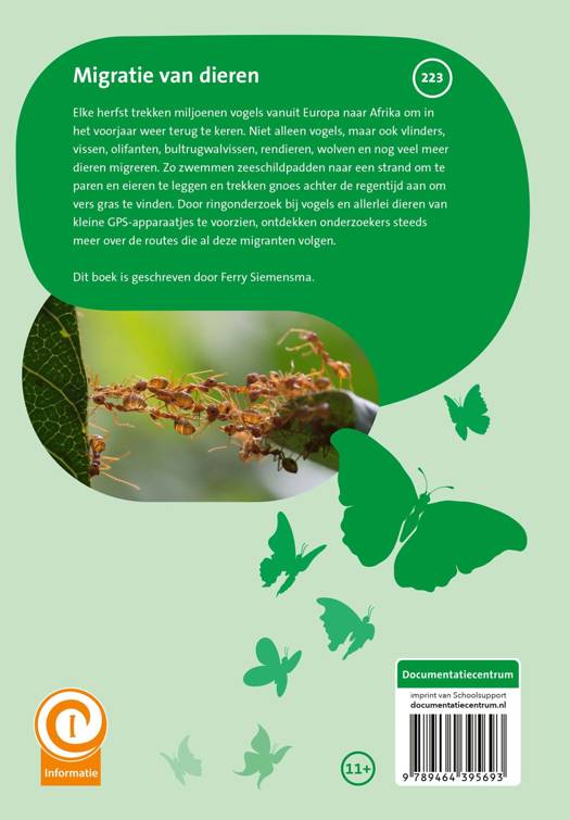 Migratie van dieren Elke herfst trekken miljoenen vogels vanuit Europa naar Afrika om in het voorjaar weer terug te keren. Niet alleen vogels, maar ook vlinders, vissen, olifanten, bultrugwalvissen, rendieren, wolven en nog veel meer dieren migreren. Zo zwemmen zeeschildpadden naar een strand om te paren en eieren te leggen en trekken gnoes achter de regentijd aan om vers gras te vinden. Door ringonderzoek bij vogels en allerlei dieren van kleine GPS-apparaatjes te voorzien, ontdekken onderzoekers steeds meer over de routes die al deze migranten volgen.