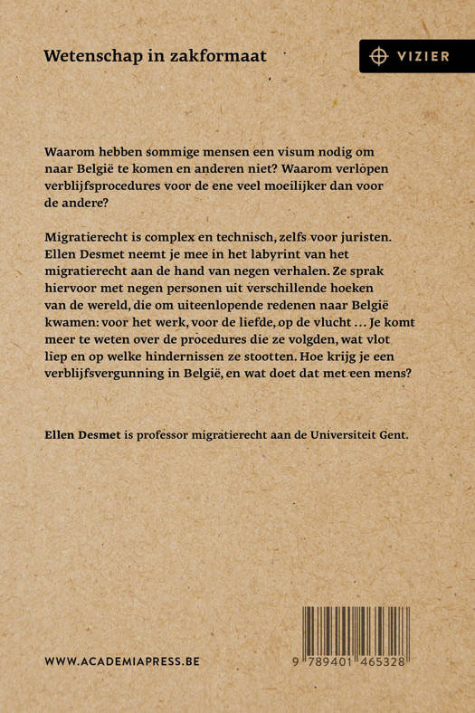 Waarom hebben sommige mensen een visum nodig om naar België te komen en anderen niet? Waarom verlopen verblijfsprocedures voor de ene veel moeilijker dan voor de andere? Migratierecht is complex en technisch, zelfs voor juristen. Ellen Desmet neemt je mee in het labyrint van het migratierecht aan de hand van negen verhalen. Ze sprak hiervoor met negen personen uit verschillende hoeken van de wereld, die om uiteenlopende redenen naar België kwamen: voor het werk, voor de liefde, op de vlucht ... Je komt meer te weten over de procedures die ze volgden, wat vlot liep en op welke hindernissen ze stootten. Hoe krijg je een verblijfsvergunning in België, en wat doet dat met een mens?