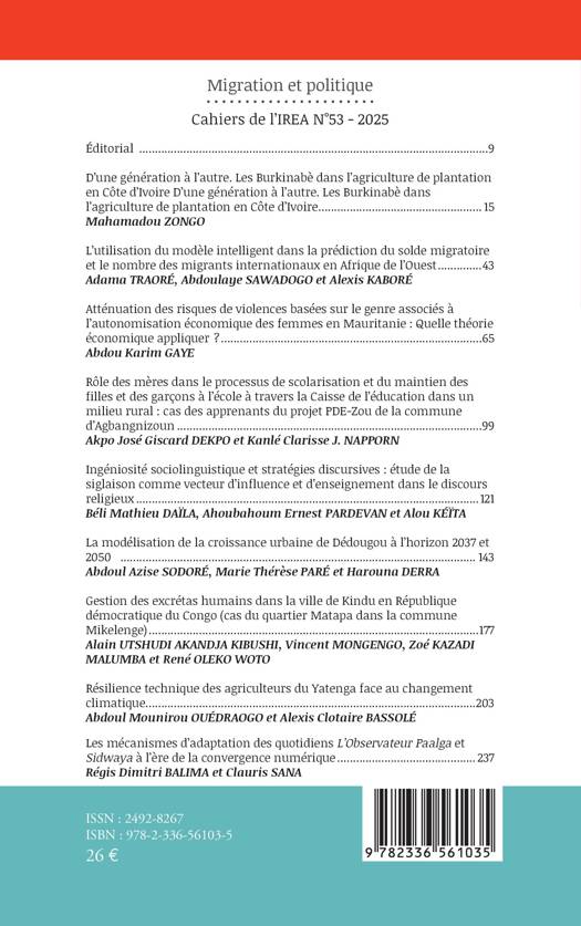 Au sommaire de ce nouveau numéro: D'une génération à l'autre. Les Burkinabè dans l'agriculture de plantation en Côte d'Ivoire de Mahamadou ZONGO - L'utilisation du modèle intelligent dans la prédiction du solde migratoire et le nombre des migrants internationaux en Afrique de l'Ouest de Adama TRAORÉ, Abdoulaye SAWADOGO et Alexis KABORÉ - Atténuation des risques de violences basées sur le genre associés à l'autonomisation économique des femmes en Mauritanie: Quelle théorie économique appliquée ? de Abdou Karim GAYE - Rôle des mères dans le processus de scolarisation et du maintien des filles et des garçons à l'école à travers la Caisse de l'éducation dans un milieu rural: cas des apprenants du projet PDE-Zou de la commune d'Agbangnizoun de Akpo José Giscard DEKPO et Kanlé Clarisse J. NAPPORN - Ingéniosité sociolinguistique et stratégies discursives: étude de la siglaison comme vecteur d'influence et d'enseignement dans le discours religieux de Béli Mathieu DAÏLA, Ahoubahoum Ernest PARDEVAN et Alou KÉÏTA - La modélisation de la croissance urbaine de Dédougou à l'horizon 2037 et 2050 de Abdoul Azise SODORÉ, Marie Thérèse PARÉ et Harouna DERRA - Gestion des excrétas humains dans la ville de Kindu en République démocratique du Congo (cas du quartier Matapa dans la commune Mikelenge) de Alain UTSHUDI AKANDJA KIBUSHI, Vincent MONGENGO, Zoé KAZADI MALUMBA et René OLEKO WOTO - Résilience technique des agriculteurs du Yatenga face au changement climatique de Abdoul Mounirou OUÉDRAOGO et Alexis Clotaire BASSOLÉ - Les mécanismes d'adaptation des quotidiens L'Observateur Paalga et Sidwaya à l'ère de la convergence numérique de Régis Dimitri BALIMA et Clauris SANA