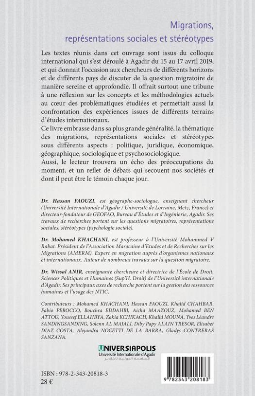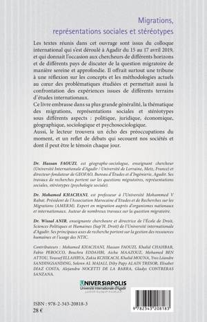 Les textes réunis dans cet ouvrage sont issus du colloque international qui s'est déroulé à Agadir en avril 2019 sur la question migratoire. Il offrait une tribune à une réflexion sur les concepts et les méthodologies actuels au coeur des problématiques étudiées et permettait aussi la confrontation des expériences issues de différents terrains d'études internationaux. Ce livre embrasse dans sa plus grande généralité, la thématique des migrations, représentations sociales et stéréotypes sous différents aspects : politique, juridique, économique, géographique, sociologique et psychosociologique.