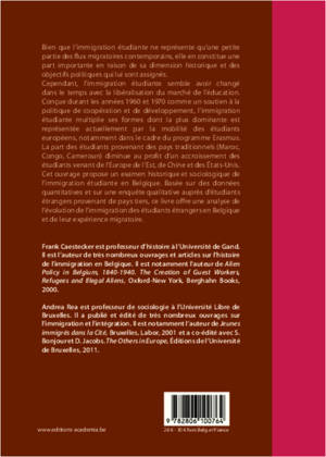 Cet ouvrage propose une analyse historique et sociologique de l'immigration étudiante en Belgique. Basée sur des données quantitatives et sur une enquête qualitative auprès d'étudiants étrangers provenant de pays tiers, ce livre offre une analyse de l'évolution de l'immigration des étudiants étrangers en Belgique. Par ailleurs, il fournit une analyse de leur expérience migratoire fondée sur des histoires d'étudiants étrangers.