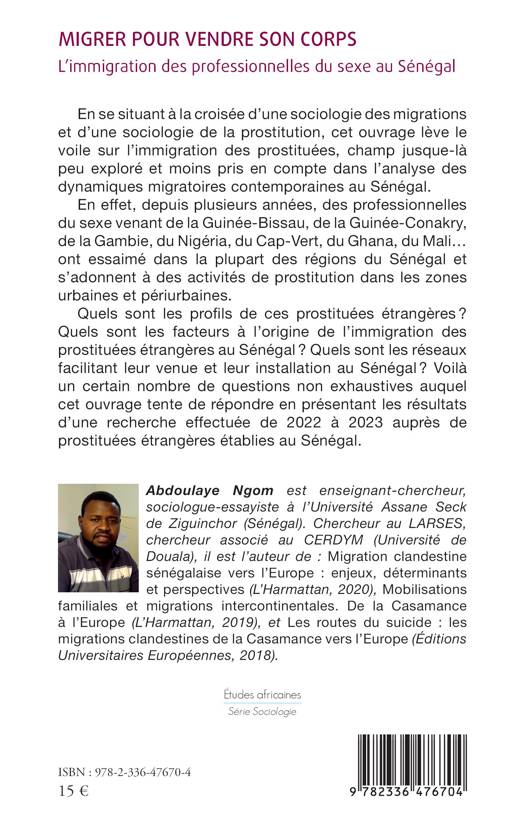 En se situant à la croisée d'une sociologie des migrations et d'une sociologie de la prostitution, cet ouvrage lève le voile sur l'immigration des prostituées, champ jusque-là peu exploré et moins pris en compte dans l'analyse des dynamiques migratoires contemporaines au Sénégal. En effet, depuis plusieurs années, des professionnelles du sexe venant de la Guinée-Bissau, de la Guinée-Conakry, de la Gambie, du Nigéria, du Cap-Vert, du Ghana, du Mali... ont essaimé dans la plupart des régions du Sénégal et s'adonnent à des activités de prostitution dans les zones urbaines et périurbaines. Quels sont les profils de ces prostituées étrangères ? Quels sont les facteurs à l'origine de l'immigration des prostituées étrangères au Sénégal ? Quels sont les réseaux facilitant leur venue et leur installation au Sénégal ? Voilà un certain nombre de questions non exhaustives auquel cet ouvrage tente de répondre en présentant les résultats d'une recherche effectuée de 2022 à 2023 auprès de prostituées étrangères établies au Sénégal.