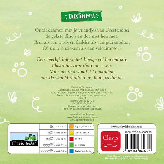 Een heerlijk interactief boekje vol herkenbare illustraties over dinosaurussen. Voor peuters vanaf 12 maanden, met de wereld rondom het kind als thema.