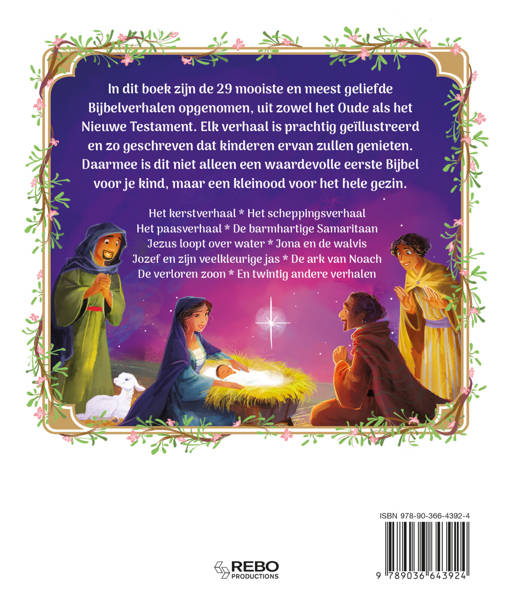 In dit boek zijn de 29 mooiste en meest geliefde Bijbelverhalen opgenomen, uit zowel het Oude als het Nieuwe Testament. Elk verhaal is prachtig geïllustreerd en zo geschreven dat kinderen ervan zullen genieten. Daarmee is dit niet alleen een waardevolle eerste Bijbel voor je kind, maar een kleinood voor het hele gezin.