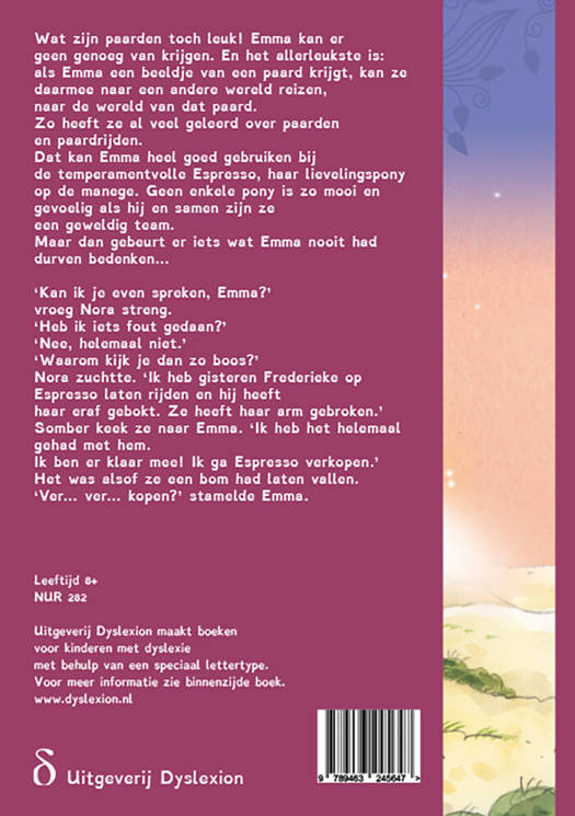 Wat zijn paarden toch leuk! Emma kan er geen genoeg van krijgen. En het allerleukste is: als Emma een beeldje van een paard krijgt, kan ze daarmee naar een andere wereld reizen, naar de wereld van dat paard. Zo heeft ze al veel geleerd over paarden en paardrijden. Dat kan Emma heel goed gebruiken bij de temperamentvolle Espresso, haar lievelingspony op de manege. Geen enkele pony is zo mooi en gevoelig als hij en samen zijn ze een geweldig team. Maar dan gebeurt er iets wat Emma nooit had durven bedenken…