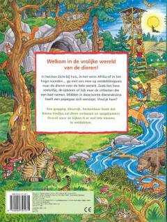 In het bos dicht bij huis, in het verre Afrika of in het hoge noorden... ga met ons mee op ontdekkingsreis naar de dieren over de hele wereld. Zoek het lieve reekalfje, de ijsberen of kijk naar de olifanten die een bad nemen. Midden in deze bonte dierendrukte heeft een papegaai zich verstopt. Vind je hem?