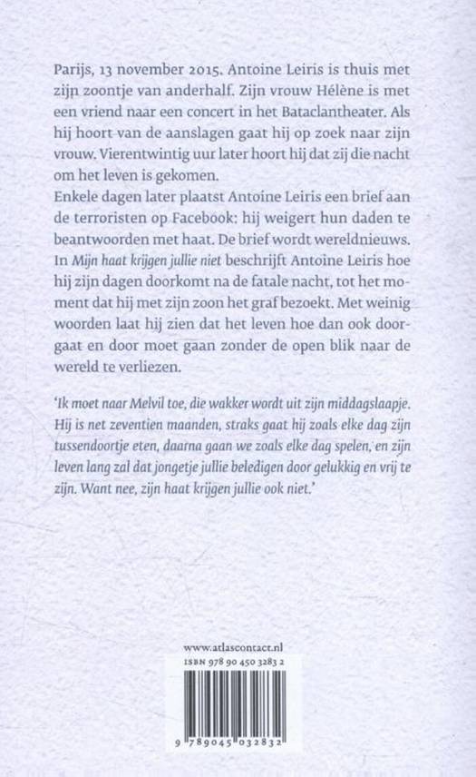 Parijs, 13 november 2015. Antoine Leiris is thuis met zijn zoontje van anderhalf. Zijn vrouw Hélène is met een vriend naar een concert in het Bataclantheater. Opeens verschijnen er berichten op zijn telefoon over aanslagen. Antoine gaat op zoek naar zijn vrouw, 24 uur later hoort hij dat zij die nacht om het leven is gekomen Enkele dagen later plaatst hij een brief aan de terroristen op Facebook: hij weigert hun daden te beantwoorden met haat. De brief wordt wereldnieuws. In Mijn haat krijgen jullie niet beschrijft Antoine Leiris hoe hij zijn dagen doorkomt na de fatale nacht, tot het moment dat hij met zijn zoon Hélène's graf bezoekt. Met weinig woorden laat hij zien dat het leven hoe dan ook doorgaat en door moet gaan zonder de open blik naar de wereld te verliezen. 'Ik moet naar Melvil toe, die wakker wordt uit zijn middagslaapje. Hij is net zeventien maanden, straks gaat hij zoals elke dag zijn tussendoortje eten, daarna gaan we zoals elke dag spelen, en zijn leven lang zal dat jongetje jullie beledigen door gelukkig en vrij te zijn. Want nee, zijn haat krijgen jullie ook niet.'