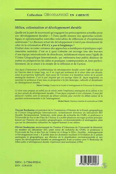 Cette étude propose un subtil jeu de miroir entre l'expérience aménagiste de la colonie et les enjeux actuels de développement durable. D'une façon originale et très éclairante, elle nous fait découvrir l'utilité, voir la nécessité du détour colonial pour enrichir les débats autour de la question environnementale et de l'aménagement.