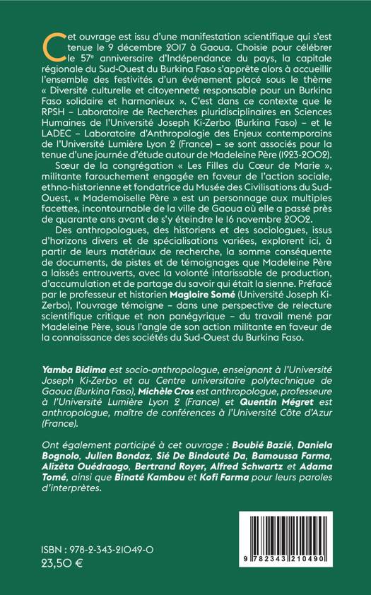 Soeur de la congrégation « Les Filles du Coeur de Marie », militante farouchement engagée en faveur de l'action sociale, ethno-historienne et fondatrice du Musée des Civilisations du Sud-Ouest, « Mademoiselle Père » est un personnage aux multiples facettes, incontournable de la ville de Gaoua où elle a passé près de quarante ans avant de s'y éteindre le 16 novembre 2002. Des anthropologues, des historiens et des sociologues explorent ici, à partir de leurs matériaux de recherche, la somme conséquente de documents, de pistes et de témoignages que Madeleine Père a laissés entrouverts. L'ouvrage témoigne du travail mené par Madeleine Père, sous l'angle de son action militante en faveur de la connaissance des sociétés du Sud-Ouest du Burkina Faso