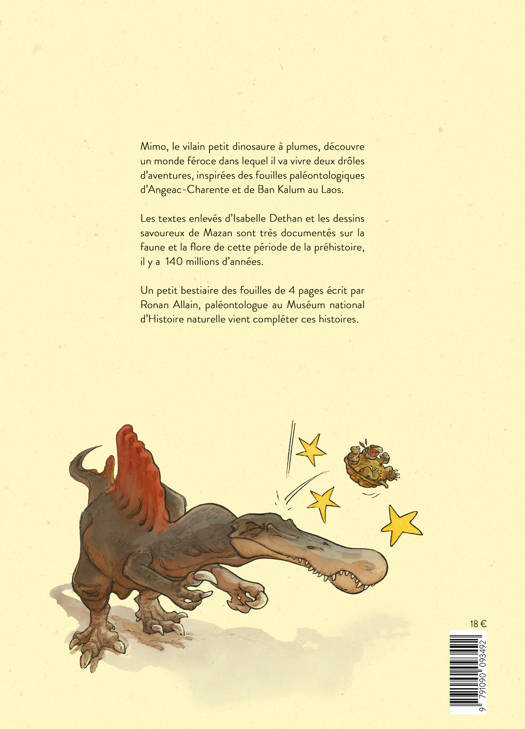 Mimo, le vilain petit dinosaure, découvre un monde féroce dans lequel il va vivre deux drôles aventures inspirées des fouilles paléontologiques d'Angeac-Charente et de Ban Kalum au Laos. Les textes enlevés d'Isabelle Dethan et les dessins savoureux de Mazan sont très documentés sur la faune et la flore de cette période de la préhistoire, il y a plus de 100 millions d'années ! Quatre pages sur les découvertes du plus grand site de fouilles d'Europe à Angeac-Charente, écrites par le paléontologue Ronan Allain et illustrées par Mazan, apporter des précisions scientifiques sur le cadre de ces histoires.