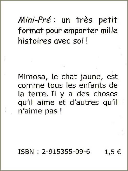 Dans la collection Mini-Pré, un très petit format pour emporter mille histoires avec soi ! - Une histoire sur les goûts des tout-petits. Mimosa, le chat jaune, est comme tous les enfants de la terre. Il y a des choses qu’il aime et d’autres qu’il n’aime pas !... Mini-Album dès 3 ans