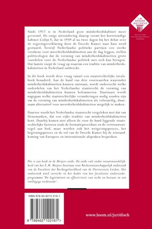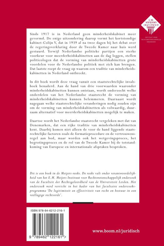 Sinds 1917 is in Nederland geen minderheidskabinet meer gevormd. De enige uitzondering daarop vormt het kortstondige kabinet-Colijn V, dat in 1939 al na twee dagen bij het debat over de regeringsverklaring door de Tweede Kamer naar huis werd gestuurd. Terwijl Nederlandse politieke partijen een sterke voorkeur voor meerderheidskabinetten aan de dag leggen, stellen politicologen dat de vorming van minderheidskabinetten grote voordelen voor de Nederlandse politiek met zich kan brengen. Dat laatste roept de vraag op waarom een traditie van minderheidskabinetten in Nederland ontbreekt. In dit boek wordt deze vraag vanuit een staatsrechtelijke invalshoek benaderd. Aan de hand van drie voorwaarden waaronder minderheidskabinetten kunnen ontstaan, wordt onderzocht welke onderdelen van het Nederlandse staatsrecht de vorming van minderheidskabinetten kunnen belemmeren. Daarnaast wordt nagegaan welke staatsrechtelijke veranderingen nodig zouden zijn om de vorming van minderheidskabinetten als volwaardig, duurzaam alternatief voor meerderheidskabinetten mogelijk te maken. Daartoe wordt het Nederlandse staatsrecht vergeleken met dat van Denemarken, dat een rijke traditie van minderheidskabinetten kent. Daarbij komen niet alleen de voor de hand liggende staatsrechtelijke factoren zoals de formatieprocedure en de vertrouwensregel aan bod, maar worden ook het wetgevingsproces, het begrotingsproces en de rol van de Tweede Kamer bij de totstandkoming van Europese en internationale afspraken besproken. Dit is een boek in de Meijers-reeks. De reeks valt onder verantwoordelijkheid van het E.M. Meijers Instituut voor Rechtswetenschappelijk onderzoek van de Faculteit der Rechtsgeleerdheid van de Universiteit Leiden. Het onderzoek werd verricht in het kader van het facultaire onderzoeksprogramma ‘De legitimiteit en effectiviteit van recht en bestuur in een veellagige rechtsorde’.