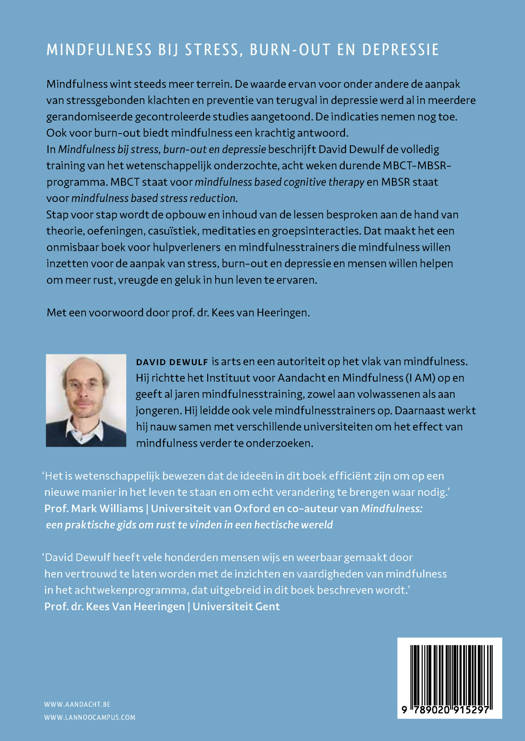 In Mindfulness bij stress, burn-out en depressie beschrijft David Dewulf de volledig training van het wetenschappelijk onderzochte, acht weken durende MBCT-MBSR-programma. MBCT staat voor mindfulness based cognitive therapy en MBSR staat voor mindfulness based stress reduction.