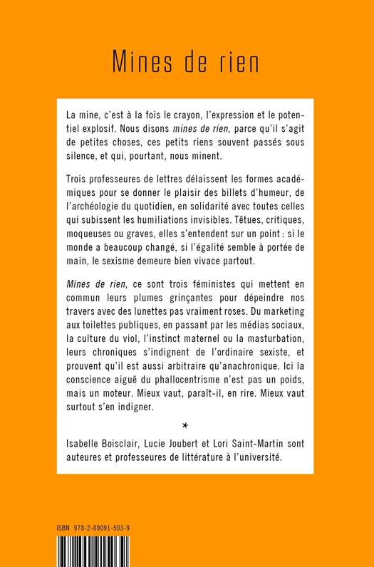 La mine, c'est à la fois le crayon, l'expression et le potentiel explosif. Nous disons mines de rien, parce qu'il s'agit de petites choses, ces petits riens souvent passés sous silence, et qui, pourtant, nous minent. Trois professeures de lettres délaissent les formes académiques pour se donner le plaisir des billets d'humeur, de l'archéologie du quotidien, en solidarité avec toutes celles qui subissent les humiliations invisibles. Têtues, critiques, moqueuses ou graves, elles s'entendent sur un point: si le monde a beaucoup changé, si l'égalité semble à portée de main, le sexisme demeure bien vivace partout. Mines de rien, ce sont trois féministes qui mettent en commun leurs plumes grinçantes pour dépeindre nos travers avec des lunettes pas vraiment roses. Du marketing aux toilettes publiques, en passant par les médias sociaux, la culture du viol, l'instinct maternel ou la masturbation, leurs chroniques s'indignent de l'ordinaire sexiste, et prouvent qu'il est aussi arbitraire qu'anachronique. Ici la conscience aiguë du phallocentrisme n'est pas un poids, mais un moteur. Mieux vaut, paraît-il, en rire. Mieux vaut surtout s'en indigner.