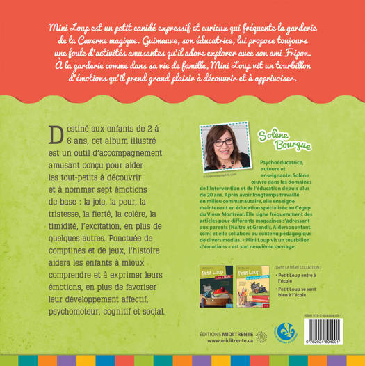 Mini Loup est un petit canidé expressif et curieux qui fréquente la garderie de la Caverne magique. Son ami Fripon et lui adorent les activités que leur propose Guimauve, leur éducatrice, car elles leur font toujours vivre un tourbillon d’émotions qu’ils prennent grand plaisir à découvrir et à apprivoiser.
