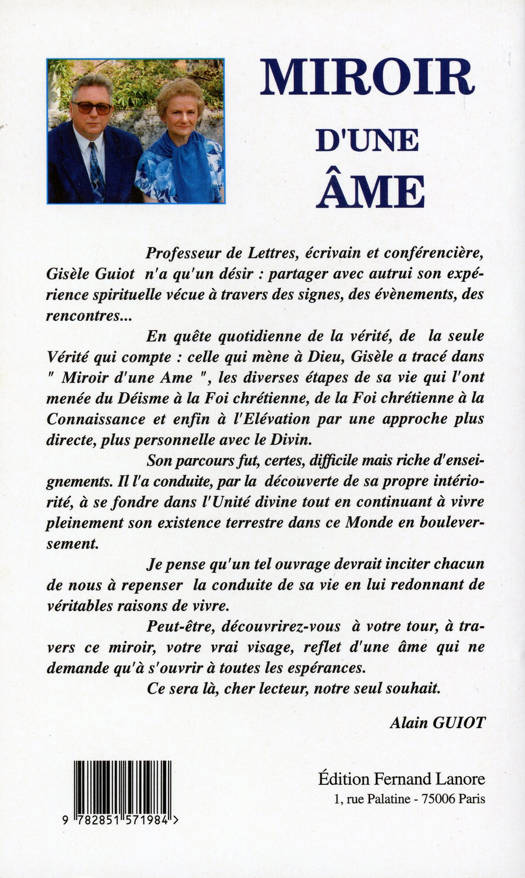 Professeur de Lettres, écrivain et conférencière, Gisèle Guiot n'a qu'un désir : partager avec autrui son expérience spirituelle vécue à travers des signes, des évènements, des rencontres... En quête quotidienne de la vérité, de la seule Vérité qui compte : celle qui mène à Dieu, Gisèle a tracé dans " Miroir d'une Ame ", les diverses étapes de sa vie qui l'ont menée du Déisme à la Foi chrétienne, de la Foi chrétienne à la Connaissance et enfin à l'Elévation par une approche plus directe, plus personnelle avec le Divin. Son parcours fut certes, difficile mais riche d'enseignements. Il l'a conduite, par la découverte de sa propre intériorité, à se fondre dans l'Unité divine tout en continuant à vivre pleinement son existence terrestre dans ce Monde en bouleversement. Je pense qu'un tel ouvrage devrait inciter chacun de nous à repenser la conduite de sa vie en lui redonnant de véritables raisons de vivre. Peut-être, découvrirez-vous à votre tour, à travers ce miroir, votre vrai visage, reflet d'une âme qui ne demande qu'à s'ouvrir à toutes les espérances. Ce sera là, cher lecteur, notre seul souhait.