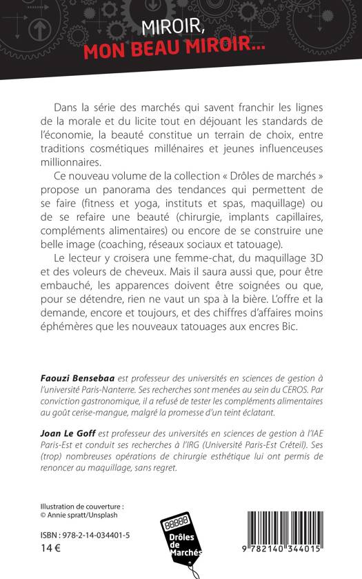 Dans la série des marchés qui savent franchir les lignes de la morale et du licite tout en déjouant les standards de l'économie, la beauté constitue un terrain de choix, entre traditions cosmétiques millénaires et jeunes influenceuses millionnaires. Ce nouveau volume de la collection « Drôles de marchés » propose un panorama des tendances qui permettent de se faire (fitness et yoga, instituts et spas, maquillage) ou de se refaire une beauté (chirurgie, implants capillaires, compléments alimentaires) ou encore de se construire une belle image (coaching, réseaux sociaux et tatouage). Le lecteur y croisera une femme-chat, du maquillage 3D et des voleurs de cheveux. Mais il saura aussi que, pour être embauché, les apparences doivent être soignées ou que, pour se détendre, rien ne vaut un spa à la bière. L'offre et la demande, encore et toujours, et des chiffres d'affaires moins éphémères que les nouveaux tatouages aux encres Bic.