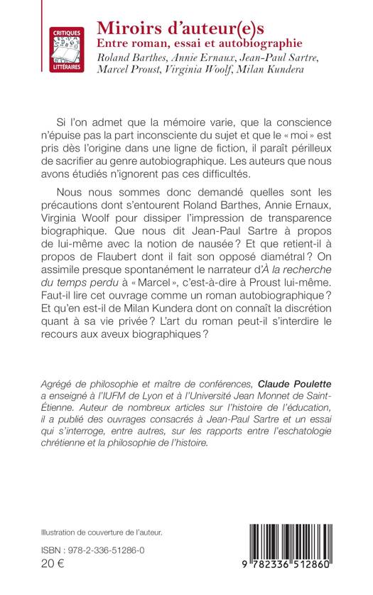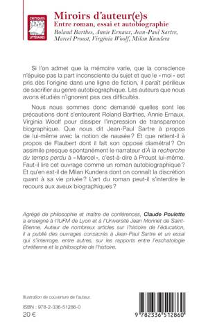 Si l'on admet que la mémoire varie, que la conscience n'épuise pas la part inconsciente du sujet et que le moi est pris dès l'origine dans une ligne de fiction, il paraît périlleux de sacrifier au genre autobiographique. Les auteurs que nous avons étudiés n'ignorent pas ces difficultés. Nous nous sommes donc demandé quelles sont les précautions dont s'entourent Roland Barthes, Annie Ernaux, Virginia Woolf pour dissiper l'impression de transparence biographique. Que nous dit Jean-Paul Sartre à propos de lui-même avec la notion de nausée ? Et que retient-il à propos de Flaubert dont il fait son opposé diamétral ? On assimile presque spontanément le narrateur d'À la recherche du temps perdu à Marcel, c'est-à-dire à Proust lui-même. Faut-il lire cet ouvrage comme un roman autobiographique ? Et qu'en est-il de Milan Kundera dont on connaît la discrétion quant à sa vie privée ? L'art du roman peut-il s'interdire le recours aux aveux biographiques ?