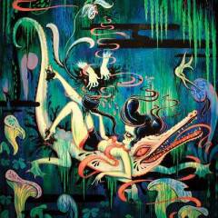 Her layered, broken narrative paintings of wasteland fairy tales are influenced by William Burroughs' cut-up writings and surrealist film, as well as vintage Disney and Fleischer cartoons, acting as critical commentaries on the failure.