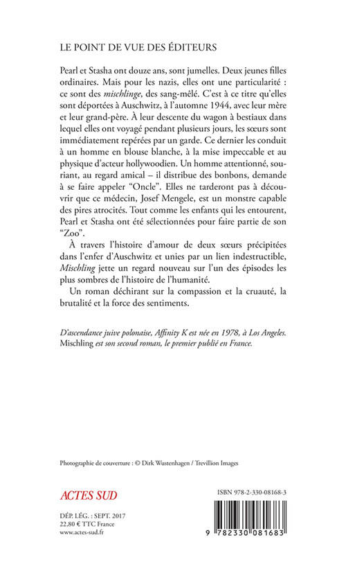 Pearl et Stasha ont douze ans, sont jumelles. Deux jeunes filles ordinaires. Mais pour les nazis, elles ont une particularité : ce sont des mischlinge, des sang-mêlé. C'est à ce titre qu'elles sont déportées à Auschwitz, à l'automne 1944, avec leur mère et leur grand-père. À leur descente du wagon à bestiaux dans lequel elles ont voyagé pendant plusieurs jours, les soeurs sont immédiatement repérées par un garde. Ce dernier les conduit à un homme en blouse blanche, à la mise impeccable et au physique d'acteur hollywoodien. Un homme attentionné, souriant, au regard amical - il distribue des bonbons, demande à se faire appeler "Oncle". Elles ne tarderont pas à découvrir que ce médecin, Josef Mengele, est un monstre capable des pires atrocités. Tout comme les enfants qui les entourent, Pearl et Stasha ont été sélectionnées pour faire partie de son "Zoo". À travers l'histoire d'amour de deux soeurs précipitées dans l'enfer d'Auschwitz et unies par un lien indestructible, Mischling jette un regard nouveau sur l'un des épisodes les plus sombres de l'histoire de l'humanité. Un roman déchirant sur la compassion et la cruauté, la brutalité et la force des sentiments.