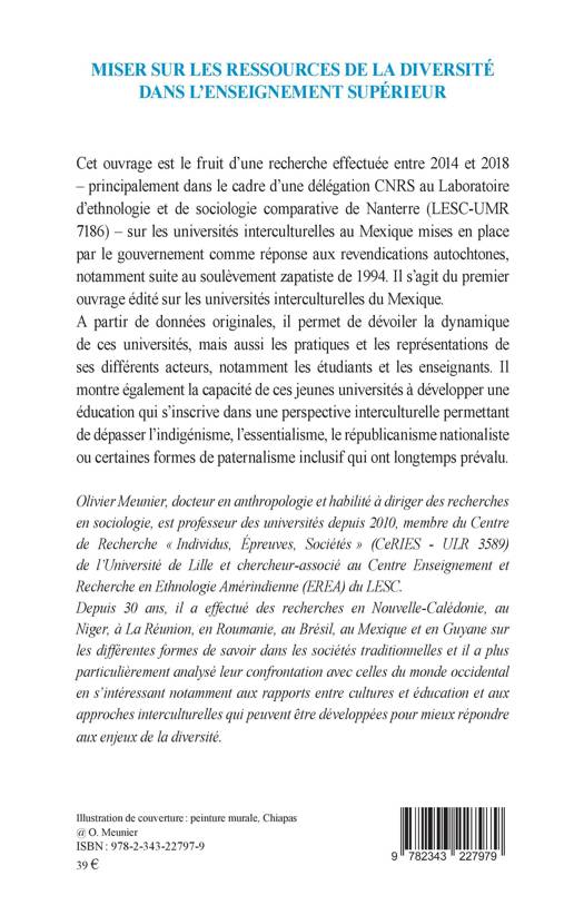 Cet ouvrage est le fruit d'une recherche effectuée entre 2014 et 2018 _ principalement dans le cadre d'une délégation CNRS au Laboratoire d'ethnologie et de sociologie comparative de Nanterre (LESC-UMR 7186) _ sur les universités interculturelles au Mexique mises en place par le gouvernement comme réponse aux revendications autochtones, notamment suite au soulèvement zapatiste de 1994. Il s'agit du premier ouvrage édité sur les universités interculturelles du Mexique. A partir de données originales, il permet de dévoiler la dynamique de ces universités, mais aussi les pratiques et les représentations de ses différents acteurs, notamment les étudiants et les enseignants. Il montre également la capacité de ces jeunes universités à développer une éducation qui s'inscrive dans une perspective interculturelle permettant de dépasser l'indigénisme, l'essentialisme, le républicanisme nationaliste ou certaines formes de paternalisme inclusif qui ont longtemps prévalu.