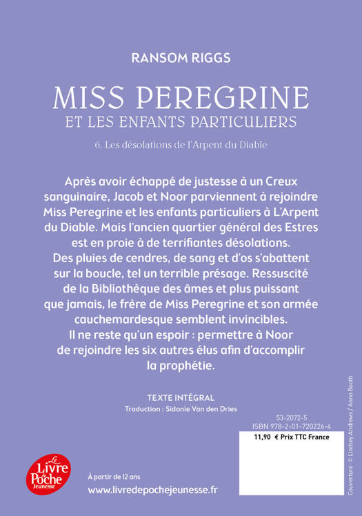 Alors que les ténèbres sont sur le point d'envahir le monde, Noor et Jacob se retrouvent à l'endroit où tout a commencé, la maison d'Abe Portman, en Floride. Ils n'ont aucun souvenir de la façon dont ils ont réussi à fuir la boucle de V, mais ils sont certains d'une chose : Caul est revenu. Après avoir échappé de justesse à un Creux sanguinaire, Jacob et Noor parviennent à rejoindre Miss Peregrine et les enfants particuliers à l'Arpent du Diable. Mais l'ancien quartier général des Estres est en proie à de terrifiantes désolations. Des pluies de cendres, de sang et d'os s'abattent sur la boucle, tel un terrible présage. Ressuscité de la Bibliothèque des âmes et plus puissant que jamais, le frère de Miss Peregrine et son armée cauchemardesque semblent invincibles... Il ne reste qu'un seul espoir : permettre à Noor de rejoindre les six autres élus afin d'accomplir la prophétie.
