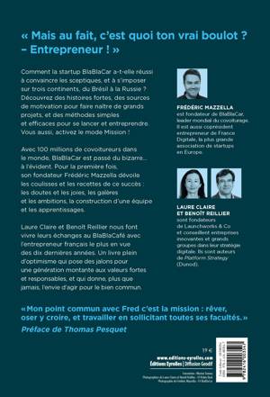 Avec 100 millions de covoitureurs dans le monde, BlaBlaCar est passé du bizarre... à l'évident. Pour la première fois, son fondateur Frédéric Mazzella dévoile les coulisses et les recettes de ce succès : les doutes et les joies, les galères et les ambitions, la construction d'une équipe et les apprentissages. Laure Claire et Benoît Reillier nous font vivre leurs échanges au BlaBlaCafé avec l'entrepreneur français le plus en vue des dix dernières années. Un livre plein d'optimisme qui pose des jalons pour une génération montante aux valeurs fortes et responsables, et qui donne, plus que jamais, l'envie d'agir pour le bien commun.