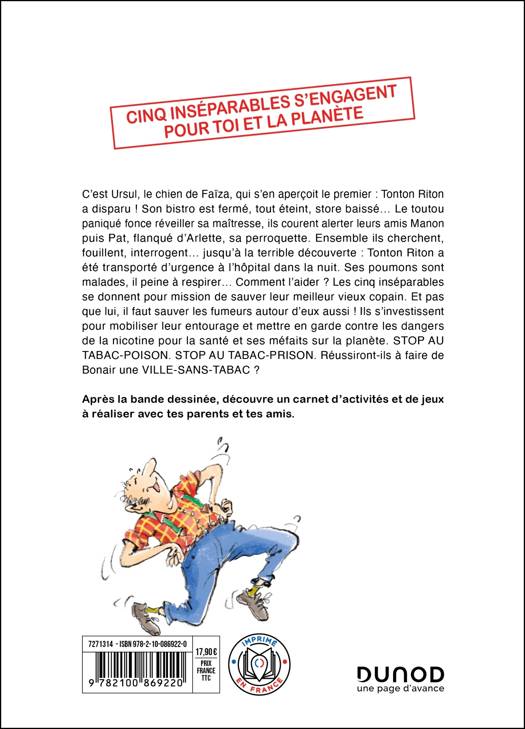 Cinq inséparables s’engagent pour toi et la planète C’est Ursul, le chien de Faïza, qui s’en aperçoit le premier : Tonton Riton a disparu ! Son bistro est fermé, tout éteint, store baissé… Le toutou paniqué fonce réveiller sa maîtresse, ils courent alerter leurs amis Manon puis Pat, flanqué d’Arlette, sa perroquette. Ensemble ils cherchent, fouillent, interrogent… jusqu’à la terrible découverte : Tonton Riton a été transporté d’urgence à l’hôpital dans la nuit. Ses poumons sont malades, il peine à respirer… Comment l’aider ? Les cinq inséparables se donnent pour mission de sauver leur meilleur vieux copain. Et pas que lui, il faut sauver les fumeurs autour d’eux aussi ! Ils s’investissent pour mobiliser leur entourage et mettre en garde contre les dangers de la nicotine pour la santé et ses méfaits sur la planète. STOP AU TABAC-POISON. STOP AU TABAC-PRISON. Réussiront-ils à faire de Bonair une VILLE-SANS-TABAC ? Après la bande dessinée, découvre un carnet d’activités et de jeux à réaliser avec tes parents et tes amis.