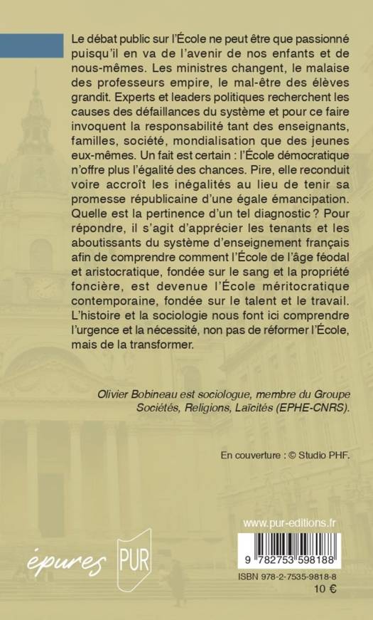 Le débat public sur l’École ne peut être que passionné puisqu’il en va de l’avenir de nos enfants et de nous-mêmes. Les ministres changent, le malaise des professeurs empire, le mal-être des élèves grandit. Experts et leaders politiques recherchent les causes des défaillances du système et pour ce faire invoquent la responsabilité tant des enseignants, familles, société, mondialisation que des jeunes eux-mêmes. Un fait est certain : l’École démocratique n’offre plus l’égalité des chances. Pire, elle reconduit voire accroît les inégalités au lieu de tenir sa promesse républicaine d’une égale émancipation. Quelle est la pertinence d’un tel diagnostic? Pour répondre, il s’agit d’apprécier les tenants et les aboutissants du système d’enseignement français afin de comprendre comment l’École de l’âge féodal et aristocratique, fondée sur le sang et la propriété foncière, est devenue l’École méritocratique contemporaine, fondée sur le talent et le travail. L’histoire et la sociologie nous font ici comprendre l’urgence et la nécessité, non pas de réformer l’École, mais de la transformer.