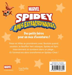 - Un petit album épais, illustré, de 32 pages, relié cartonné, avec un niveau et un temps de lecture (env. 5 min) adaptés aux plus petits. - Une histoire inédite pour suivre les missions des jeunes Peter Parker (Spidey), Gwen Stacy (Ghosty) et Miles Morales (Spin). - Des nouvelles aventures qui sont l’occasion de faire découvrir aux enfants la bienveillance, le courage, l’amitié et la force du travail en équipe !
