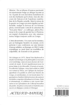 «Mission» : De sa tribune d'orateur paroissial, un missionnaire belge en Afrique raconte sa vie. Il parle de son réel désir d'améliorer le sort des habitants qu'il côtoie, loin des discours du Vatican et de l'opulence matérialiste de la Flandre actuelle. Mais le retour de la guerre au Congo est aussi régulier qu'inéluctable, malgré la ferveur de cet homme pieux, souvent juste. Loin de la caricature du "bon père blanc", ce soliloque, plein d'humour et de coups de gueule face à l'horreur, est inspiré d'entretiens avec des missionnaires belges toujours actifs au Congo.