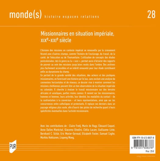 L’histoire des missions en contexte impérial se renouvelle par le croisement fécond avec d’autres champs, comme l’histoire de l’esclavage, du travail, de la santé, de l’éducation ou de l’humanitaire. L’utilisation de concepts des études postcoloniales, tels le genre ou la « race », permet aussi d’éclairer des rapports de pouvoir au sein des missions jusqu’alors restés dans l’ombre. Des archives plus facilement accessibles et un intérêt renouvelé pour leur étude contribuent enfin au dynamisme du champ. En partant de la grande variété des situations, des acteurs et des pratiques missionnaires, en favorisant une histoire par le bas, sans exclure une analyse de connexions horizontales et de réseaux, ce dossier vise à montrer comment les missions chrétiennes peuvent être un bon observatoire de la situation impériale ou coloniale. Il cherche à évaluer le travail missionnaire sur des terrains africains et asiatiques, parfois moins connus. Il revient sur les missionnaires, hommes et femmes, leurs activités, leur identité, les modalités du contact – de la confrontation à la conversion – et leurs représentations, ainsi que sur les concurrences entre catholiques et protestants. Il replace ces derniers dans un paysage religieux plus vaste, afin d’ouvrir des pistes de recherche quant à leurs spécificités éventuelles dans l’activité missionnaire.