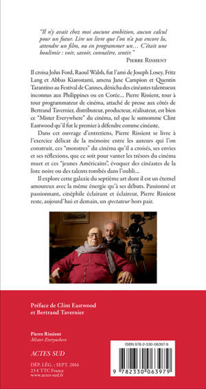 Cinéphile éclairant et éclaireur, Pierre Rissient fut, tour à tour, programmateur de cinéma, attaché de presse, distributeur, producteur, réalisateur... Dénicheur de talents également puisqu'il a oeuvré à la reconnaissance européenne d'Eastwood, Schatzberg, Coppola, Tarantino, l'Australienne Jane Campion, le Chinois de Hong Kong King Hu, ou encore le Philippin Lino Brocka. Dans cet ouvrage, il se livre à cet exercice délicat de la mémoire. Il revient sur ces auteurs qui l'ont construit, ces "monstres" qu'il a croisés (Walsh, Lang, Huston), ses envies de cinéma et ses petites histoires, ses réflexions sur le cinéma, il évoque également ces cinéastes de la liste noire ou ces talents tombés dans l'oubli...
